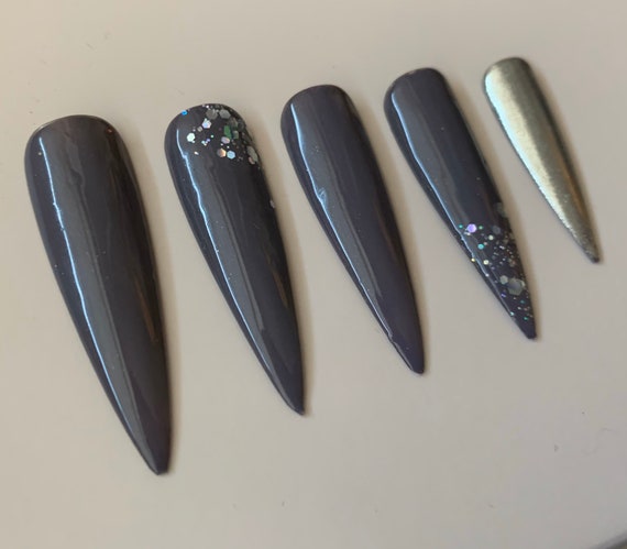 Grey Chrome Glitter Coffin Nails Stiletto Nails Press On Etsy
