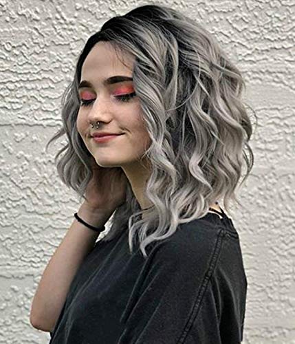 Short Wavy Curly Ombre Gray Bob Hair Dark Roots Synthetic Side Part Wig Two Tone Ebay