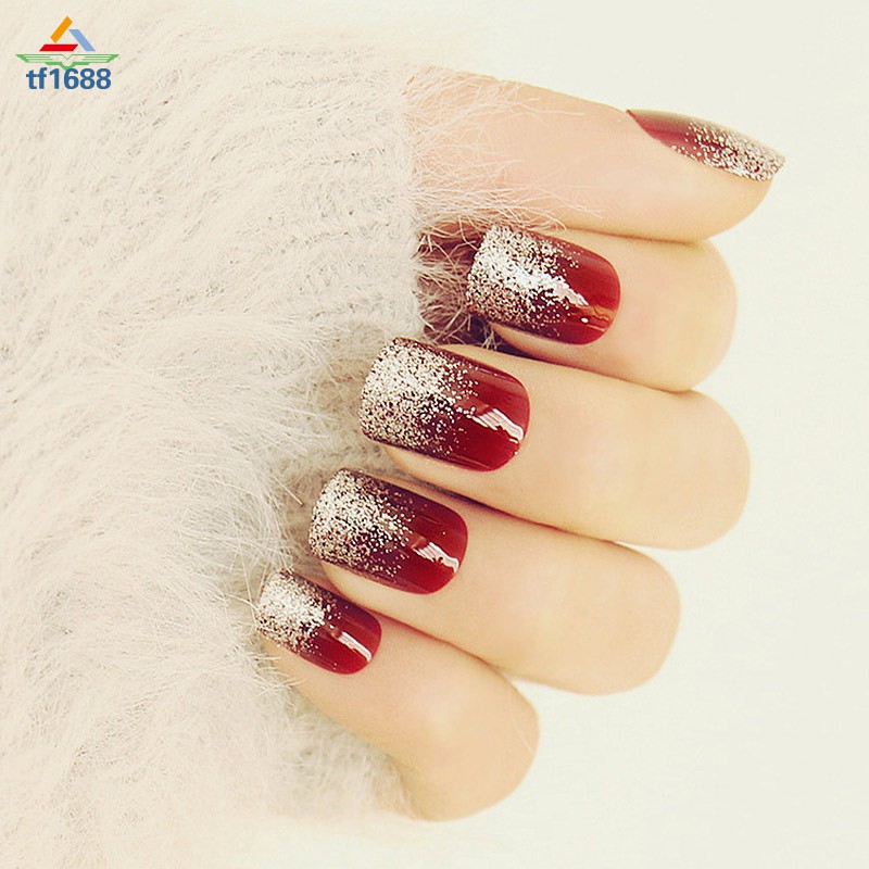 24pcs Short Wine Red Nail Art Short False Nails With Golden Glitter Wedding Nail Tip Full Nail Polish 2g Glue False Nails Aliexpress